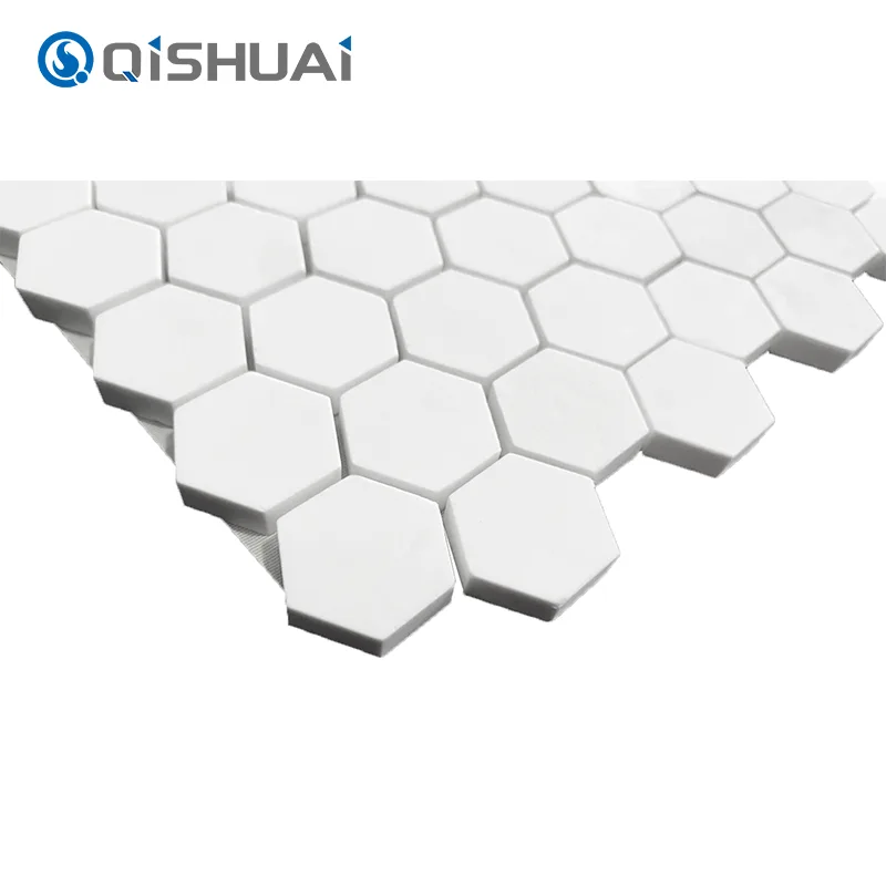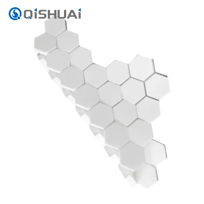 Shandong Qishuai Wear-Resistant Equipment Co., Ltd.s högkvalitativa hexaluminiumoxid-keramiska mosaik, som illustreras, har en distinkt hexagonal design som skiljer dem från vanliga kvadratiska eller cirkulära plattor. Varje sexkantig keramisk mosaikplatta av aluminiumoxid har släta, flytande kanter med utsökta detaljer som är tydligt synliga.