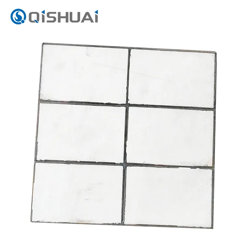 Den gummiinbäddade keramiska slitplattan från Shandong Qishuai Wear-Resistant Equipment Co., Ltd. visar en design som kombinerar två separata lager. Denna design integrerar keramiska plattor med ett gummiskikt. De olika lagren ger olika funktioner men fungerar i kombination. Denna kombination ger skydd mot slitage för utrustning.